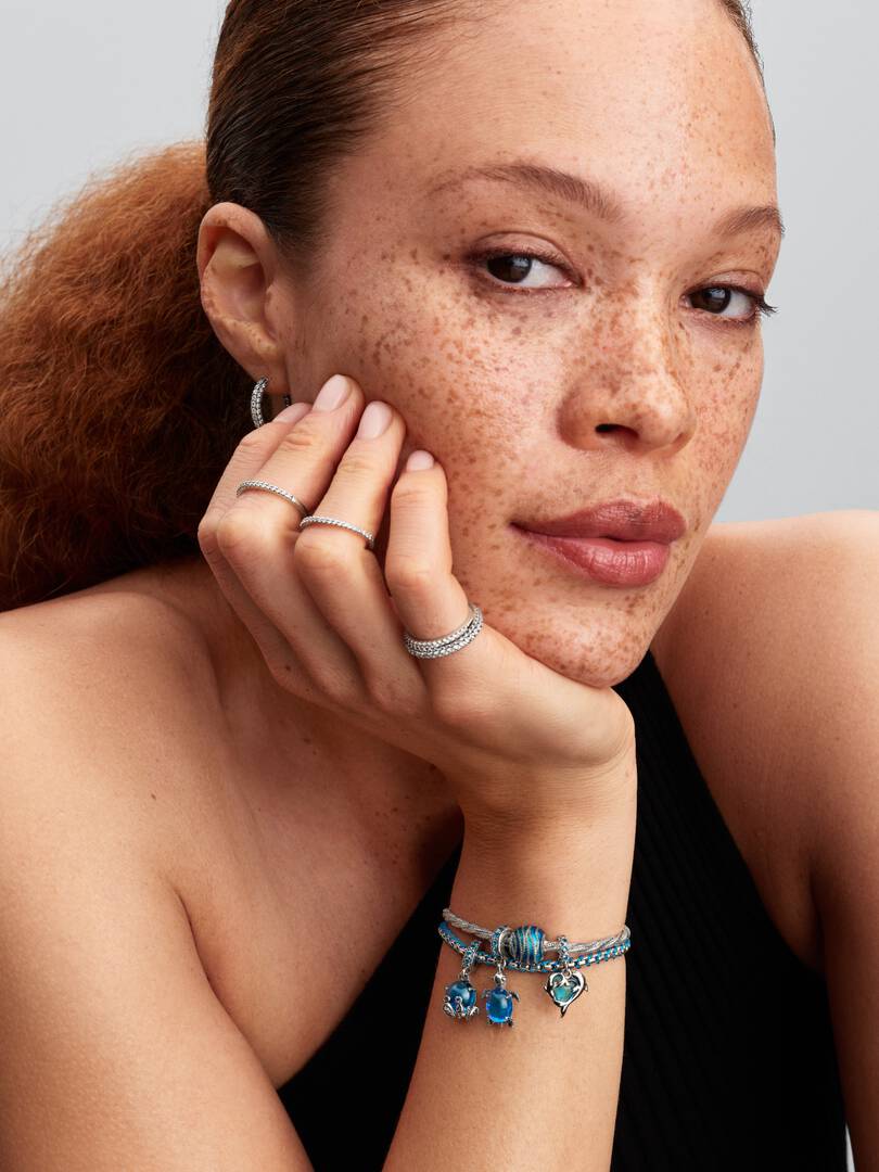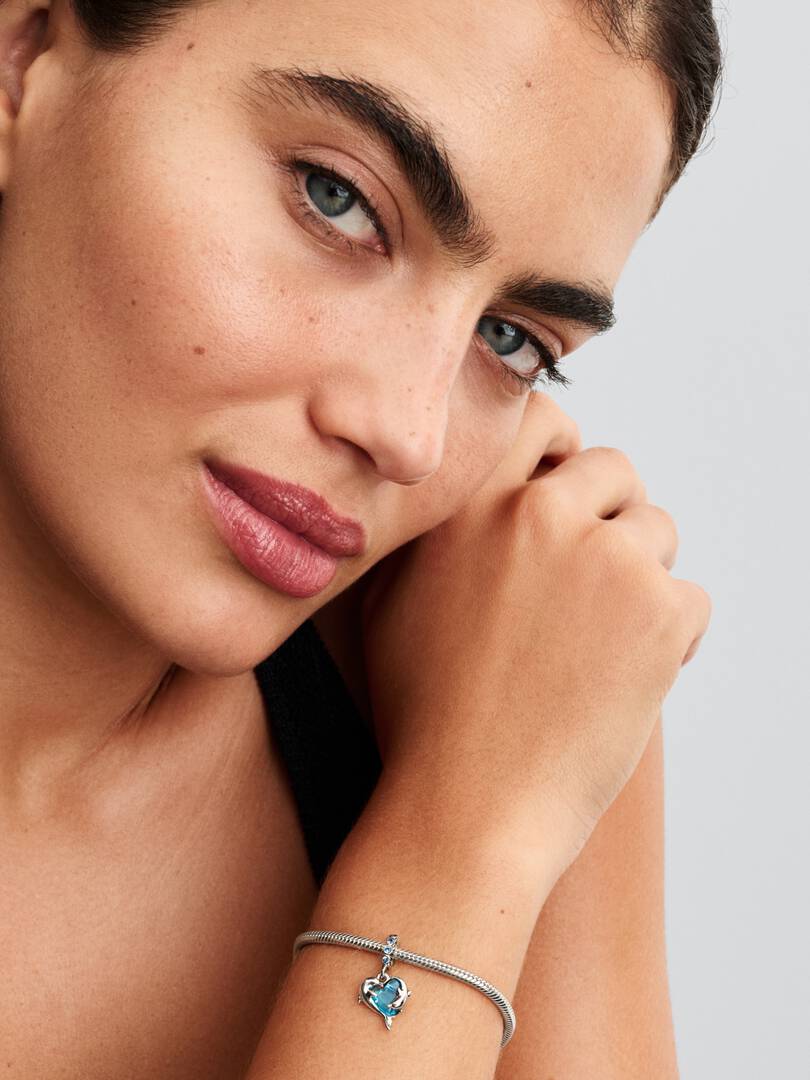 Dive into the world of playful guardians of the sea with this charming dangle, where two dolphins dance around a beautiful Murano glass heart.