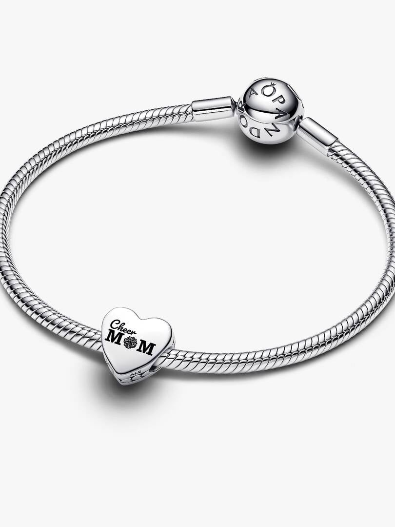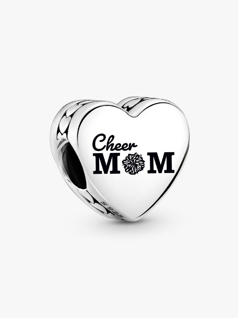 Show your cheerleading pride with this sterling silver Engravable Cheer Mom Heart Charm, featuring a row of polished hearts around the edges. Engraved with “Cheer Mom,” with a pom pom as the “O,” this charm is a perfect