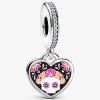 adding a touch of sparkle. The heart itself is engraved with a traditional sugar skull design, complete with a colorful flower crown, and adorned in vibrant shades of black, pink, and orange. A meaningful tribute to the tradition of honoring loved ones, this charm is perfect for bringing joy and remembrance to your collection.