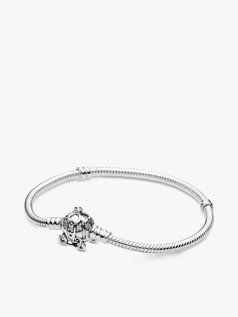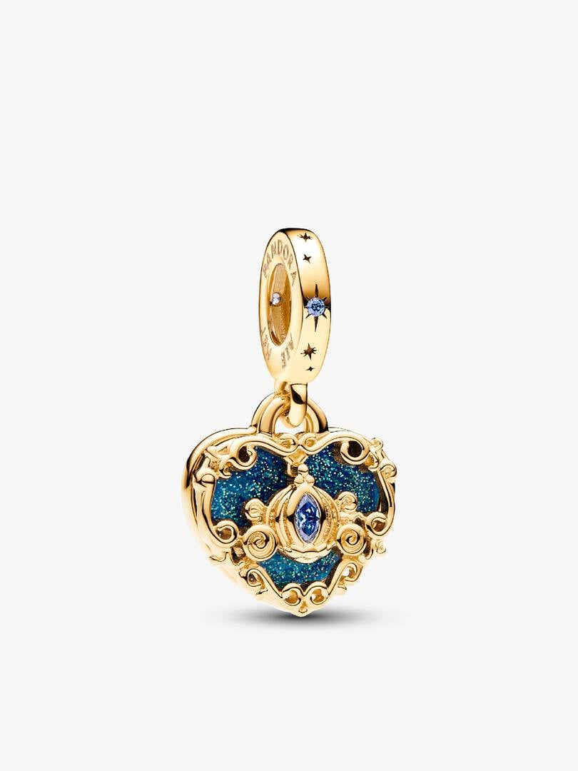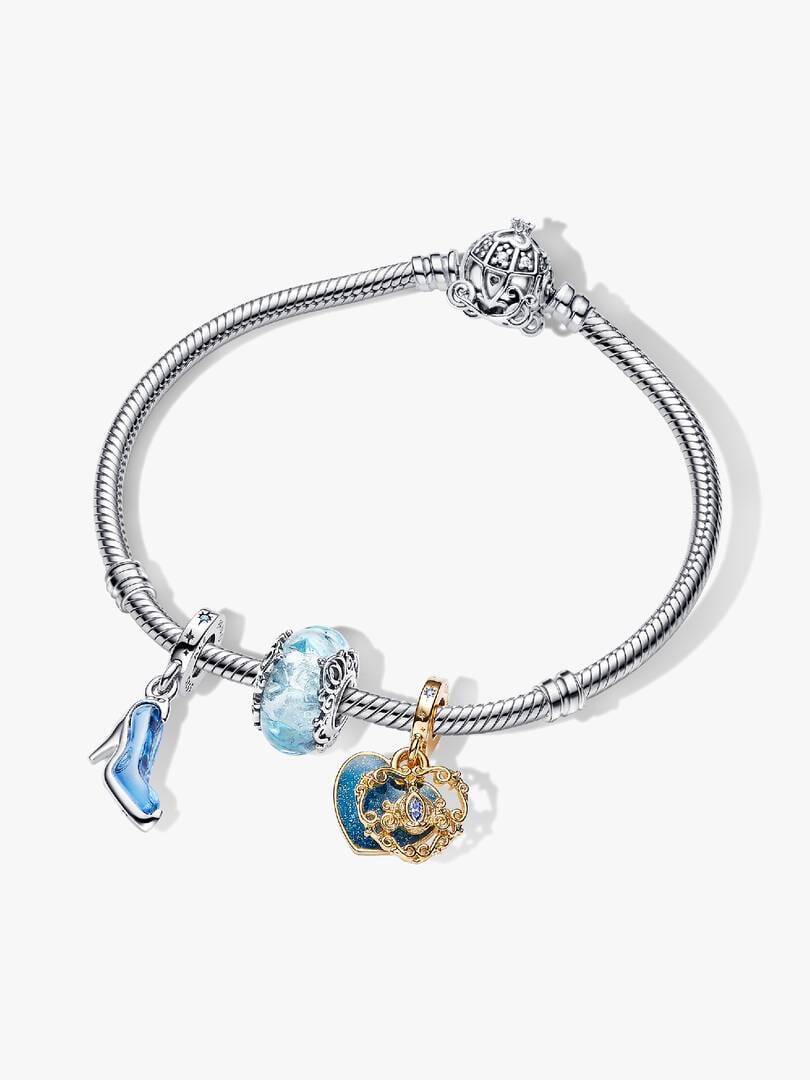 light blue Murano glass charm, and a carriage-inspired 14k gold-plated double dangle heart charm, engraved with the message “A Dream is a wish your heart makes.”. Complete with an enchanting sterling silver bracelet, these styles won’t go *poof* after midnight.