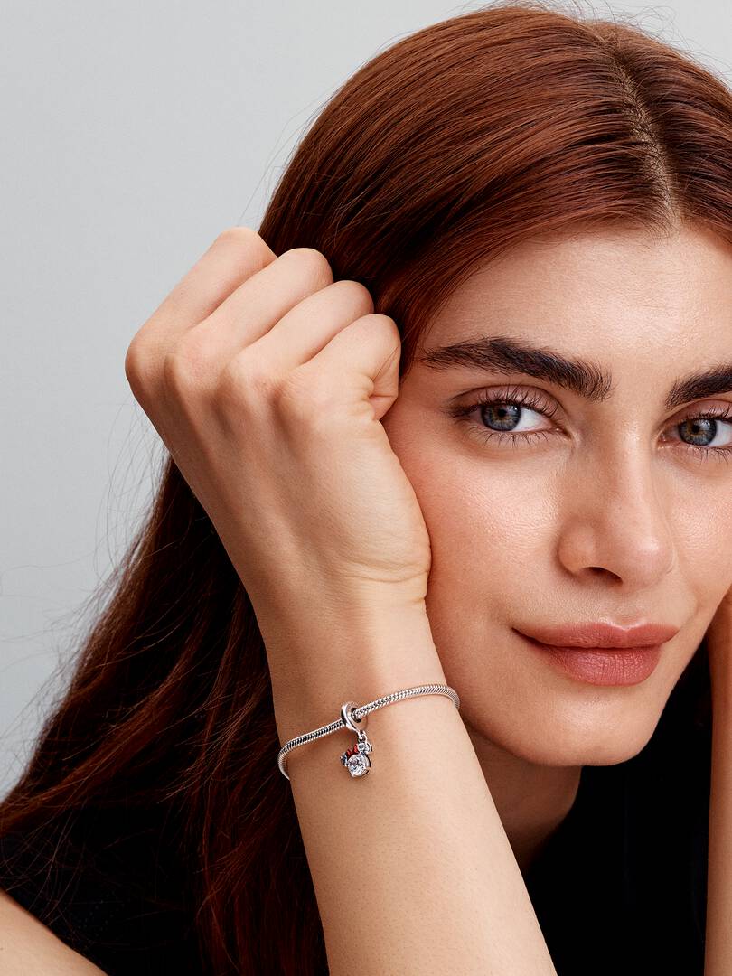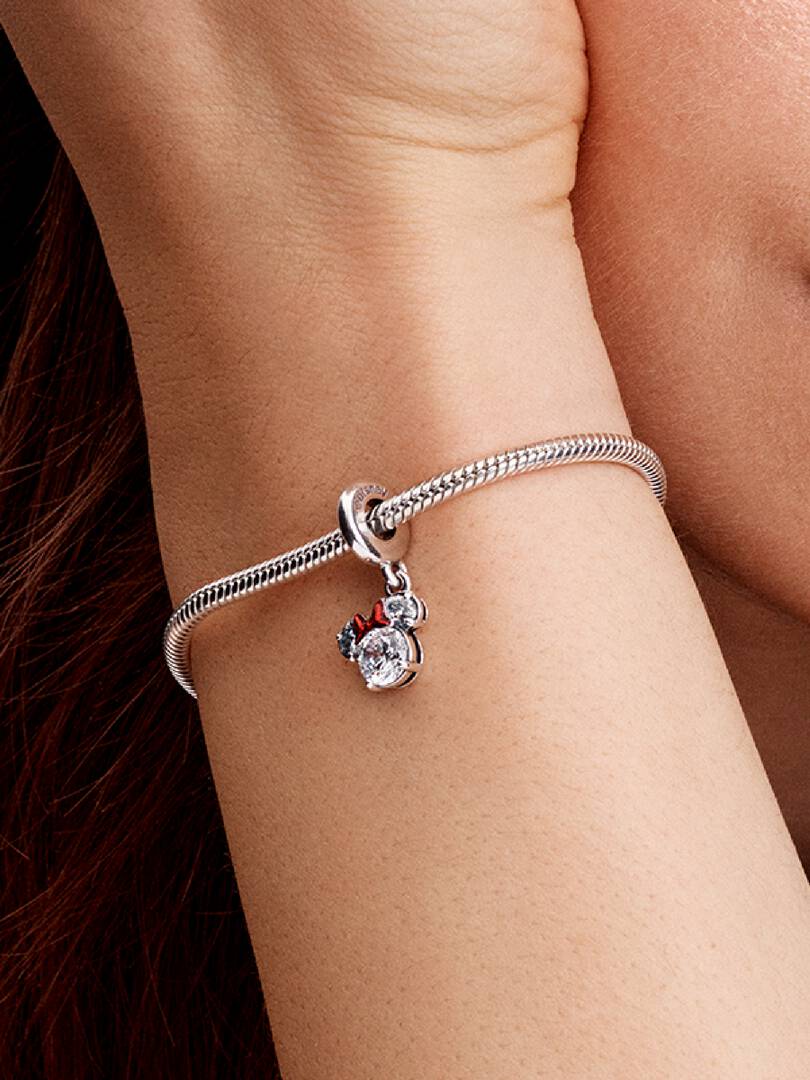 Add a touch of Disney magic to your collection with our Disney Minnie Mouse Silhouette Dangle Charm. Featuring three sparkling stones arranged in Minnie Mouse’s silhouette and her iconic red bow in glittery enamel, this