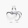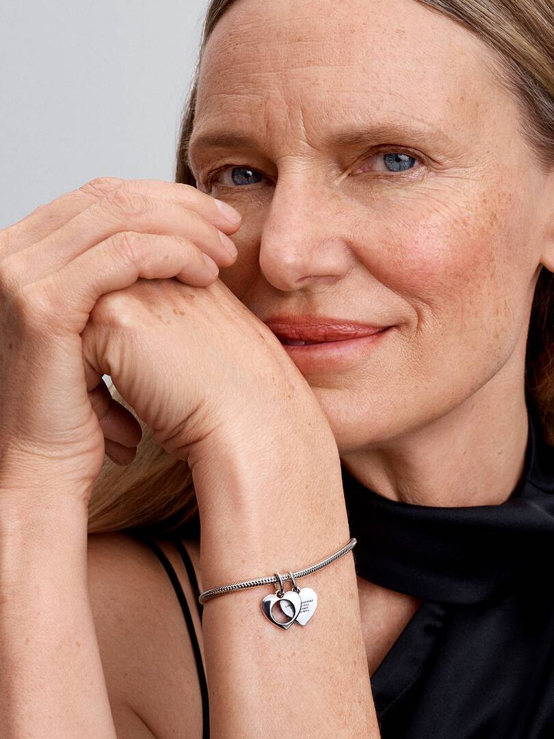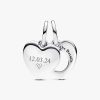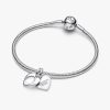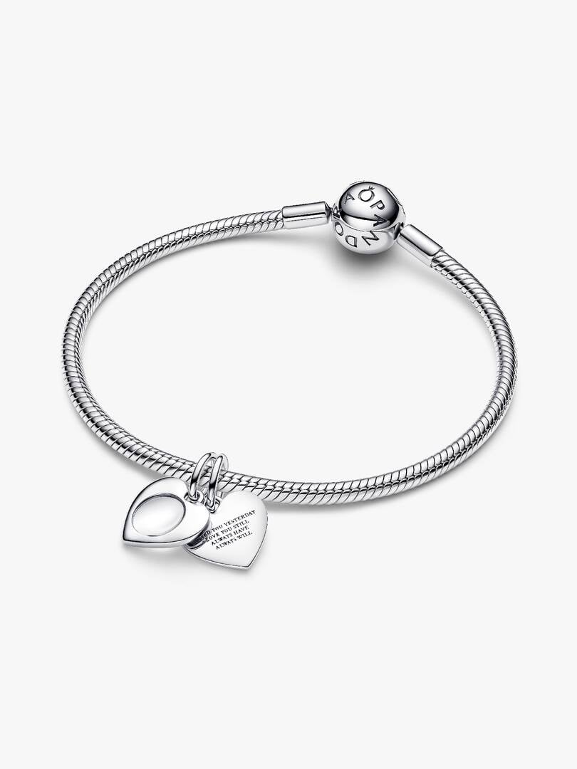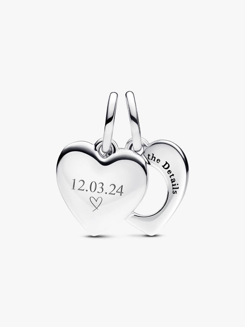 This engravable magnifying glass charm is a unique piece with a special message of love. Crafted from sterling silver, this double dangle charm features one heart with a functional magnifying glass engraved with “Love is
