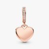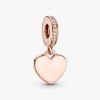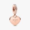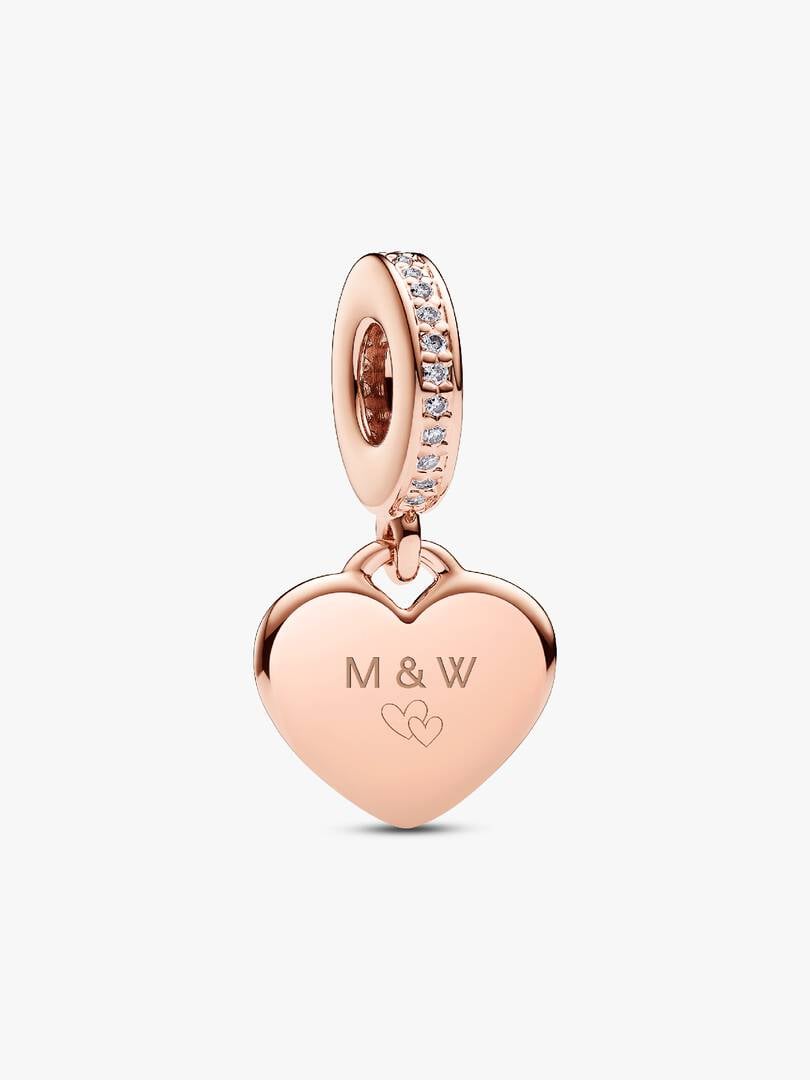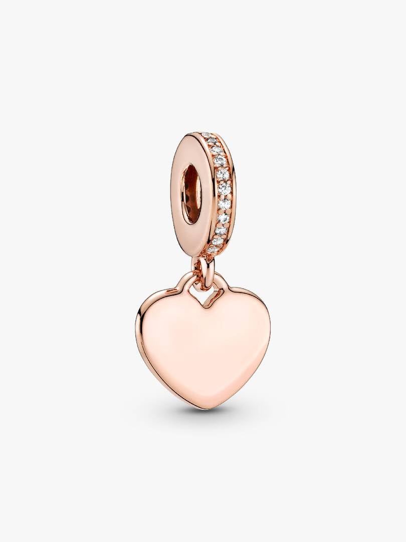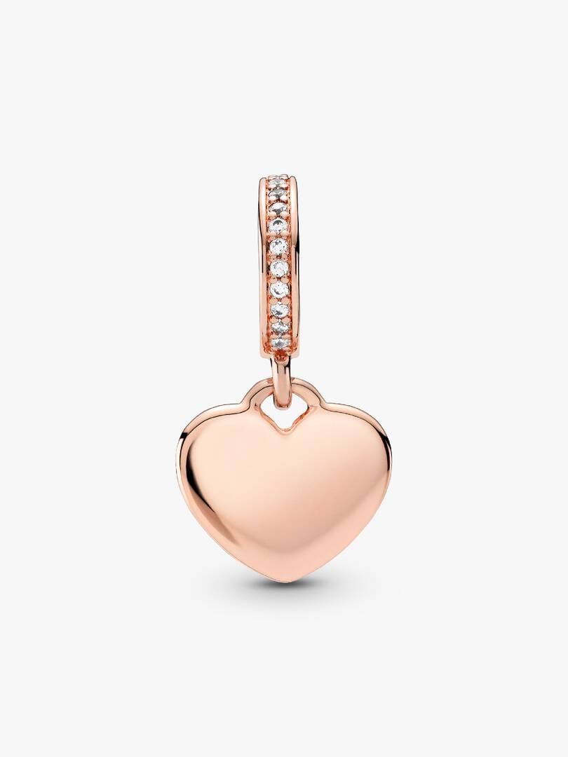 Spread the feeling of love with the Engravable Heart Tag Dangle Charm. Hand-finished in 14k rose gold plating, this polished heart-shaped dangle is engravable on the front and back and features sparkling clear stones on