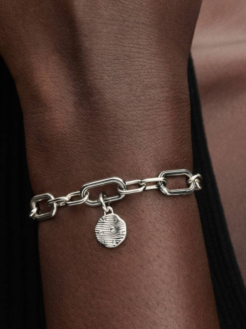 Celebrate life’s moments with a symbol of freedom and expression. This mini medallion charm features wavy lines and stones, creating a bold and creative look.