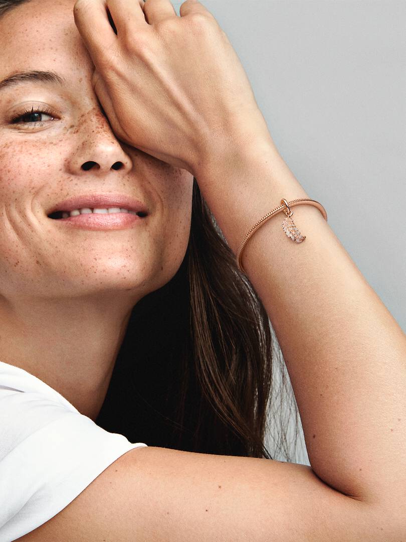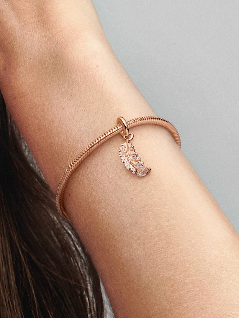 Catch the season’s light with our Floating Curved Feather Dangle Charm. This 14k rose gold-plated dangle charm features a feather curved to look like it is suspended in the air, delicately falling to the ground. The fron