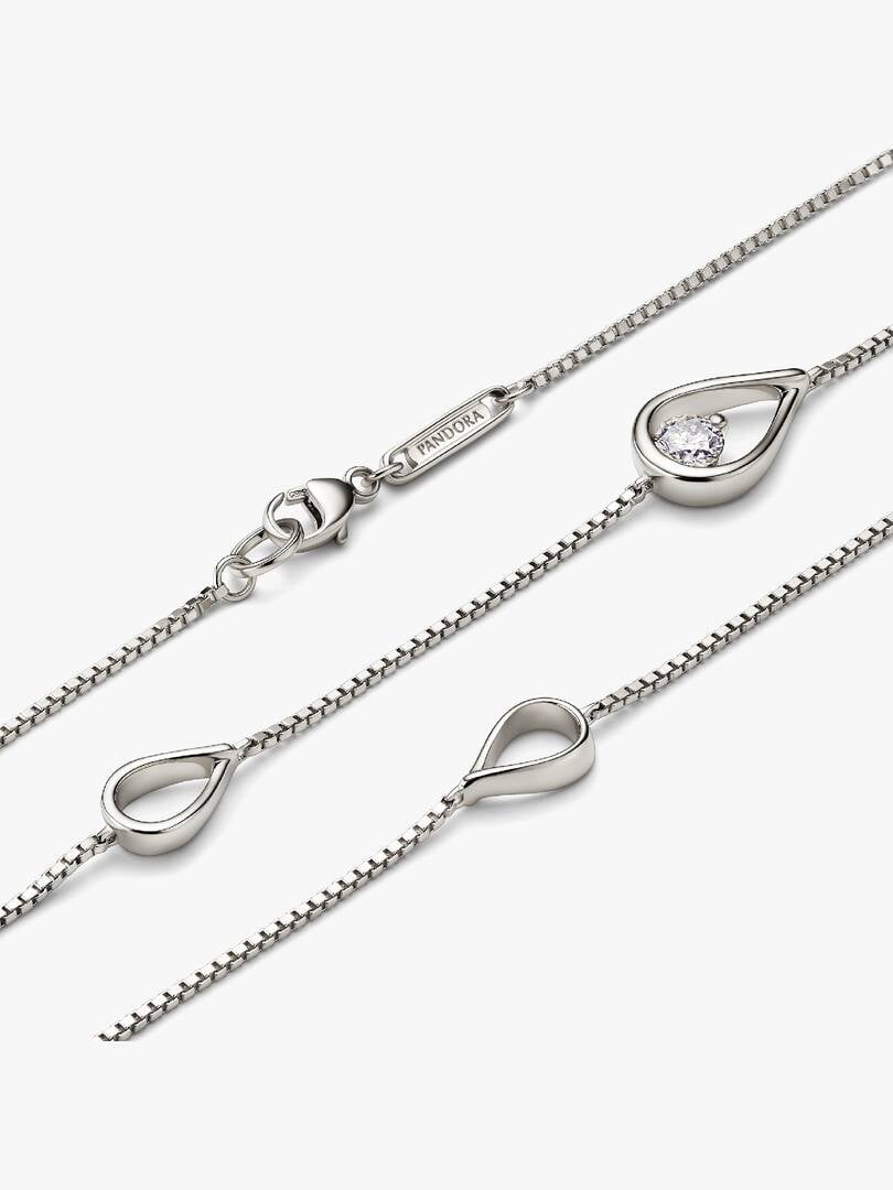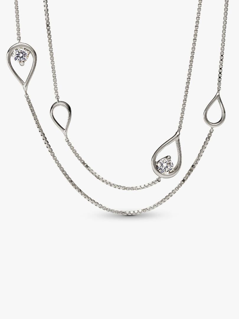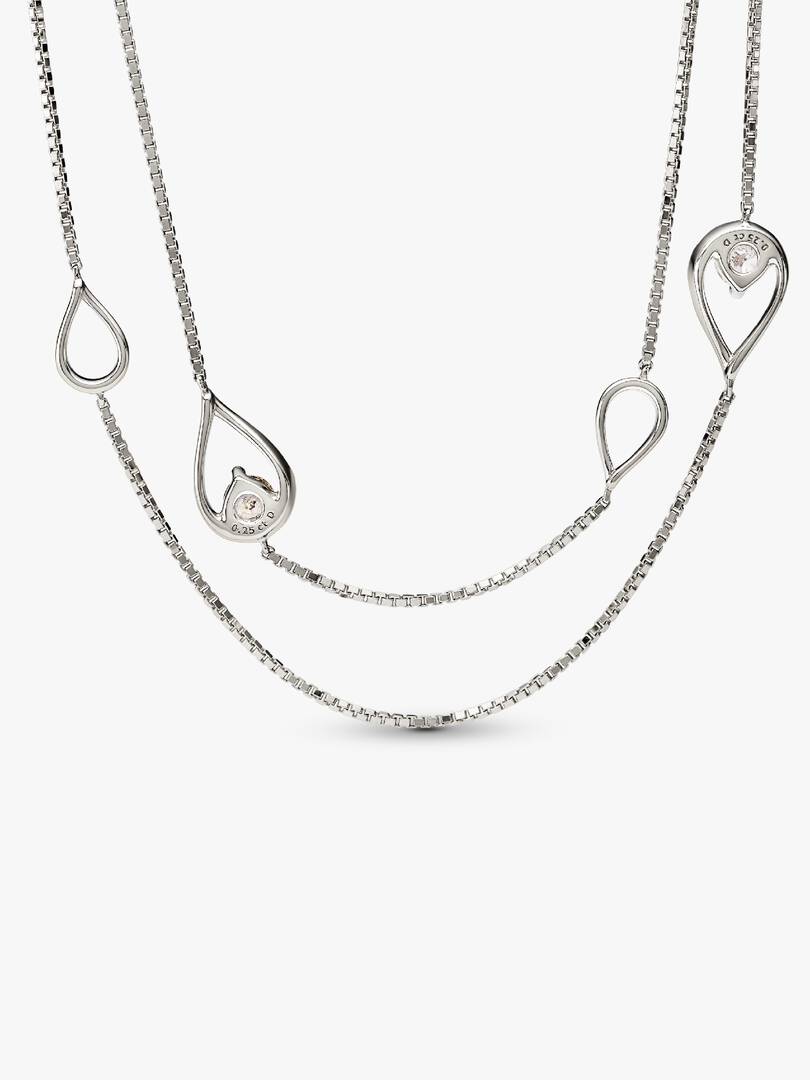 This radiant lab-grown diamond necklace features modern interpretations of infinity motifs, set on a long 14k white gold box chain that can be doubled up for layered styling. The chain features five fixed infinity pendan