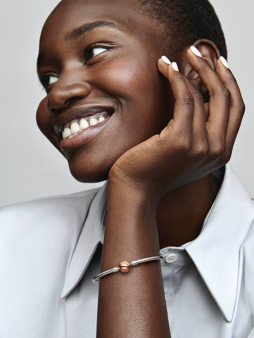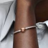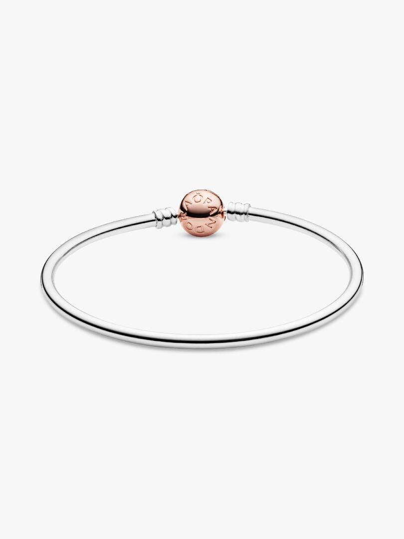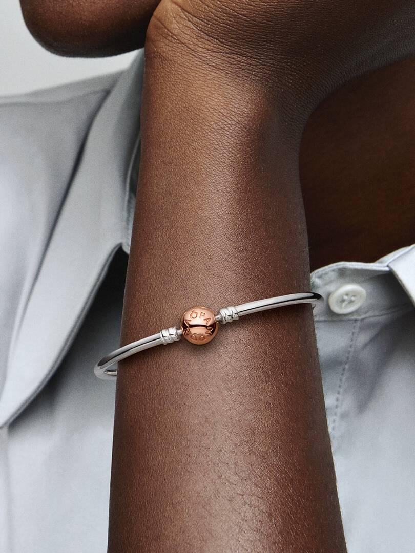 iled with our logo, creating a harmonious pairing of silver and rose hues. The 14k rose gold plating brings a subtle pink glow to the classic piece. Wear the versatile bracelet with or without charms.