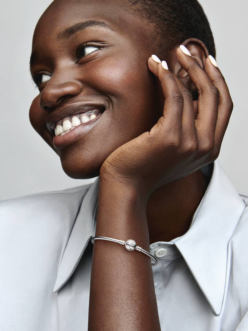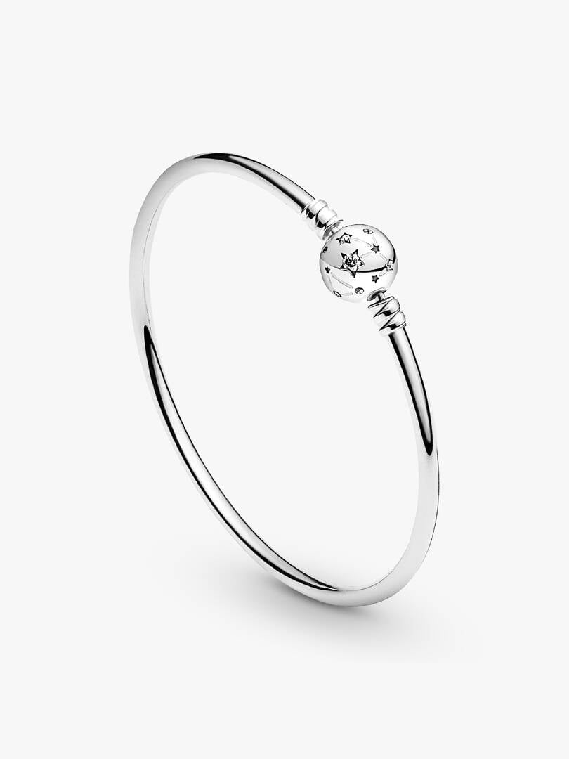Inspired by the starry night sky, the brand Moments Stars & Galaxy Bangle will bring celestial sparkle to your look. Hand-finished in sterling silver, the bangle’s ball-shaped clasp features engraved stars and clear cu