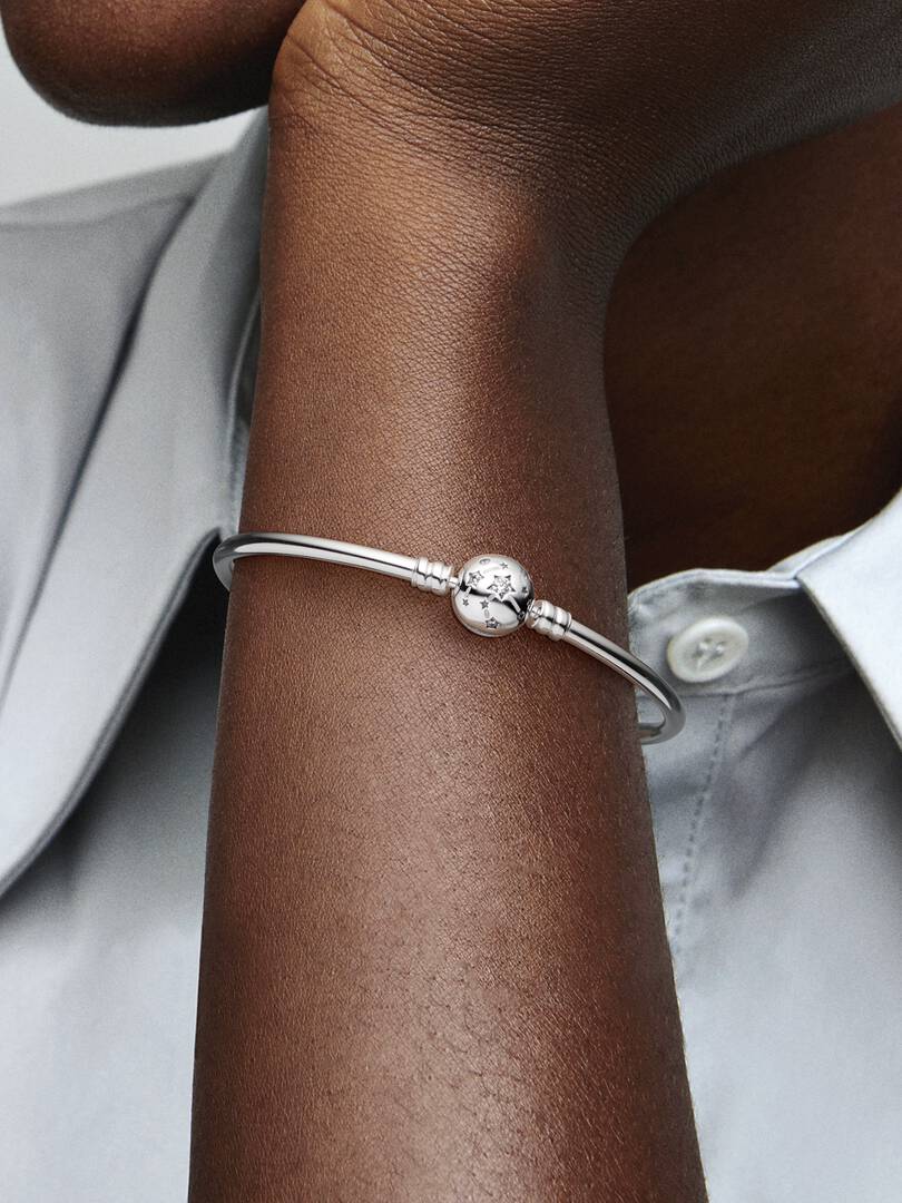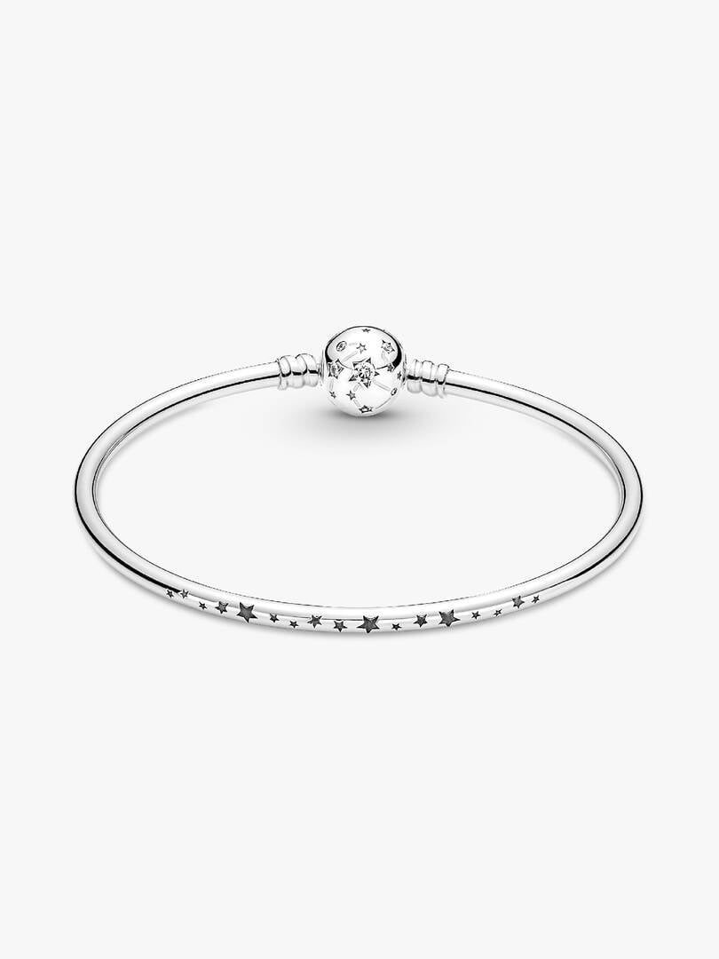 bic zirconia stones, while the back side of the shank features engraved stars. This piece can be combined with up to 16-18 brand Moments charms and dangles. Wear this bangle with other celestial-inspired designs for a look that’s out of this world.
