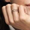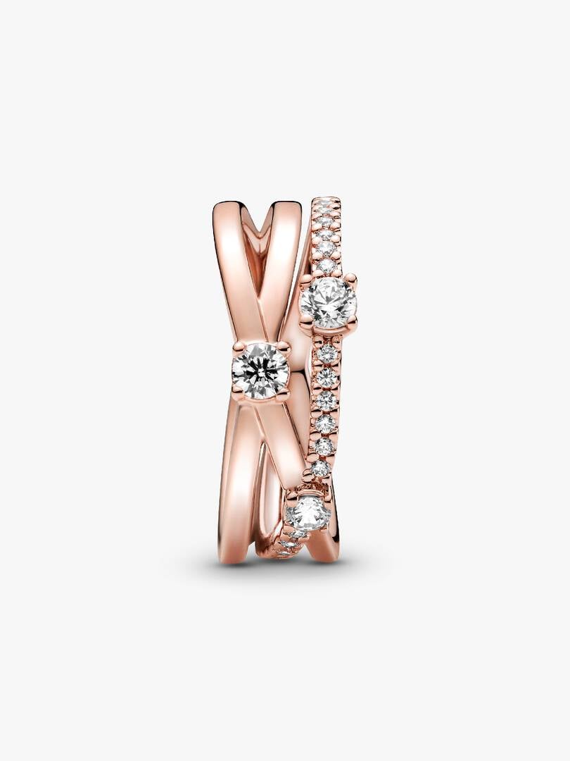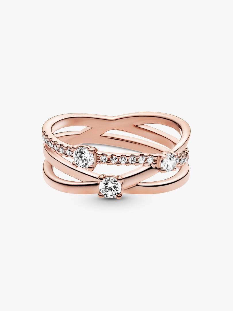 For a classic touch, go for the Sparkling Triple Band Ring. Hand-finished in 14k rose gold plating, this style features three interlinked rings. Small clear cubic zirconia decorate the top of one ring shank, while three