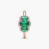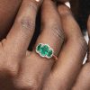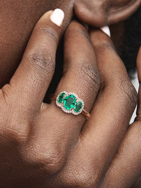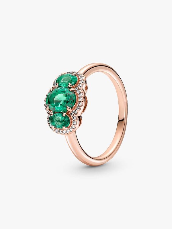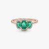 Elevate any look with the Three Stone Vintage Ring. Hand-finished in our 14k rose gold-plated unique metal blend, this ring is set with two oval cut green crystals on either side of a large oval green center stone. A cle