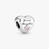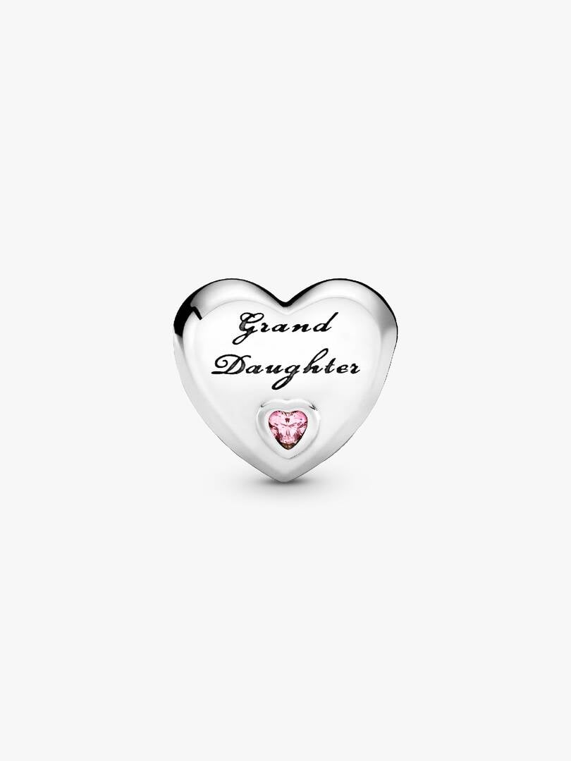 Celebrate the bond between grandparents and granddaughters with this sterling silver family charm, shaped as a heart. Polished to a high shine, the simple yet meaningful style is trimmed with heart-shaped pink stones and