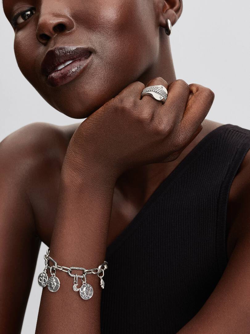 A symbol of renewal, coiled in sterling silver. Inspired by ancient coins, this powerful medallion features a flush-set clear cubic zirconia and is engraved with ‘MEMENTO VIVERE’ — Latin for ‘REMEMBER TO LIVE’.