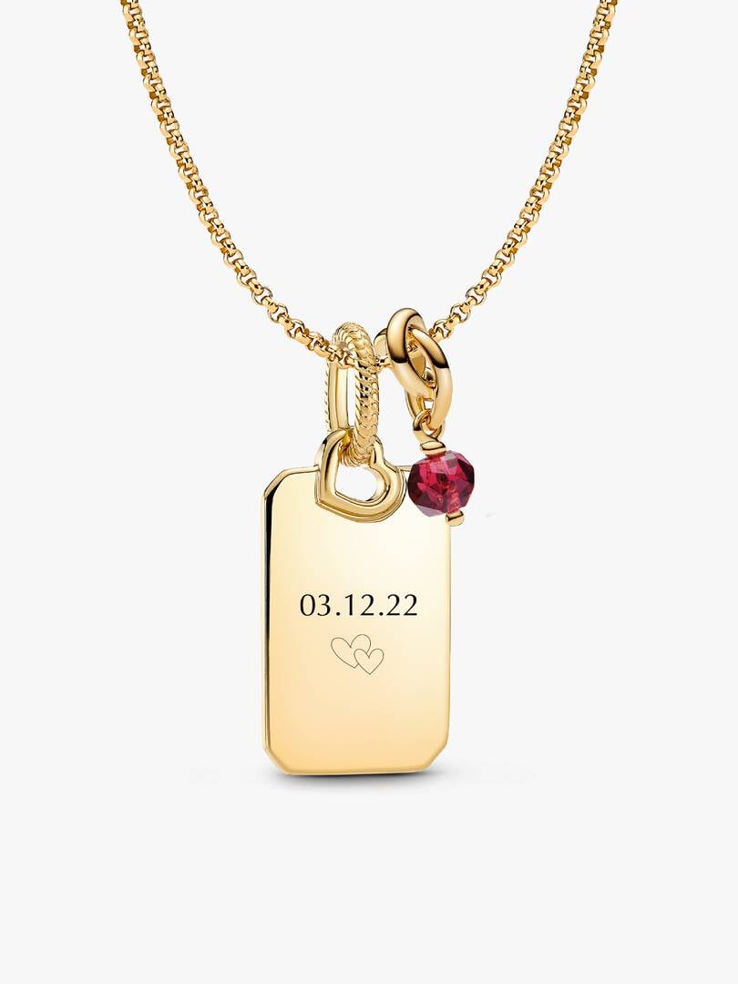 Turn up the heat with the July Engravable Dangle Charm Necklace Set! The set features the adjustable Rolo Chain Necklace, crafted from 14k gold-plated sterling silver, paired with the Engravable Rectangle Tag Pendant for