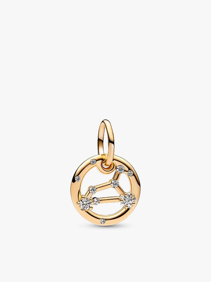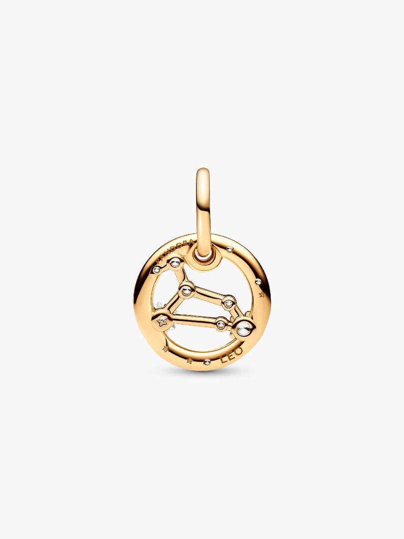 Let the stars guide your look with the Leo Zodiac Dangle Charm. This brand Moments dangle charm is crafted our 14k gold-plated unique metal blend, has a circular outer frame and features clear sparkling cubic zirconia