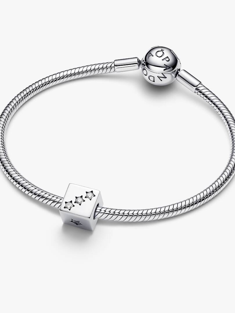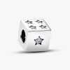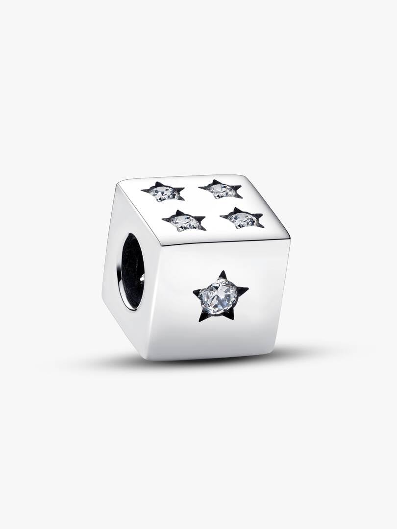 This six-sided sterling silver dice features round stones in star settings on each side representing numbers one, three, four and six.