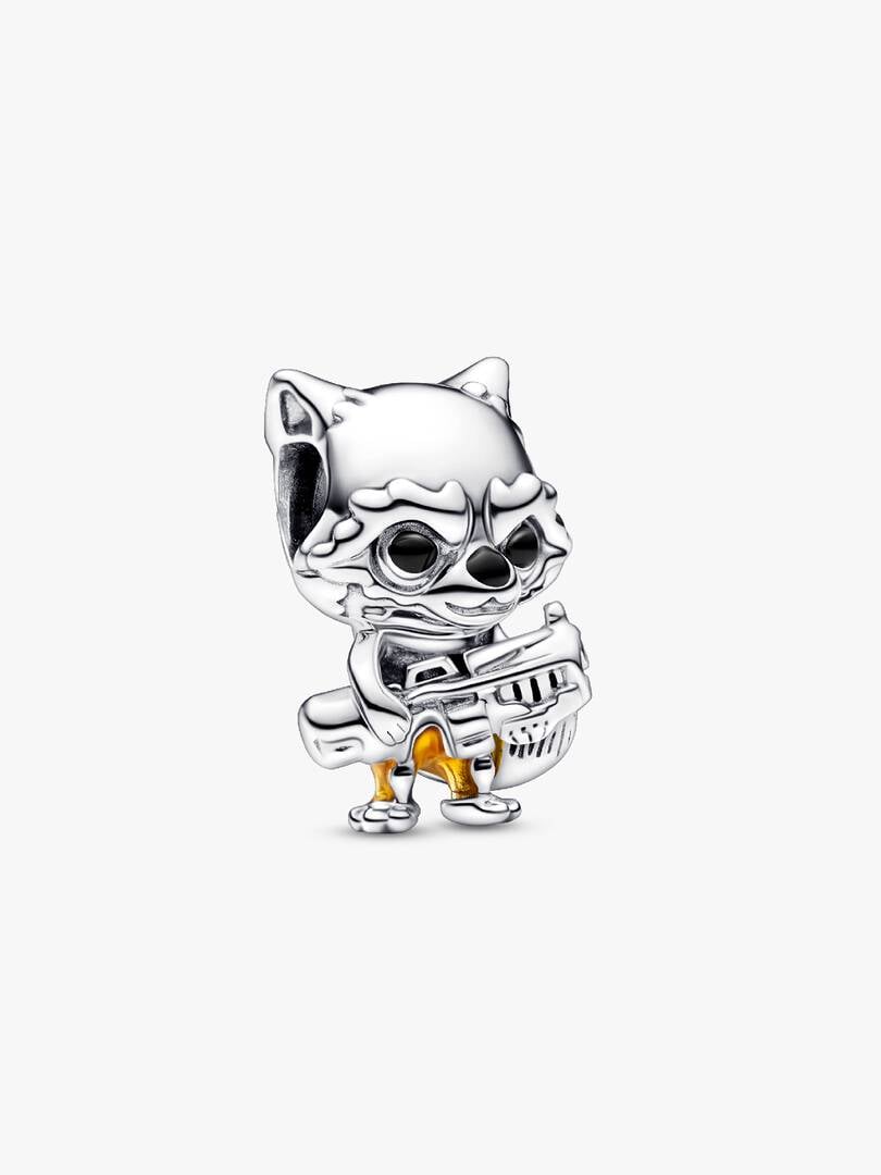 Our Marvel Guardians of the Galaxy Rocket Raccoon Charm. An expert pilot and marksman, Rocket poses with his Laser Cannon and Aero-Rigs jetpack. He is crafted in sterling silver with hand-applied enamel detailing to acce