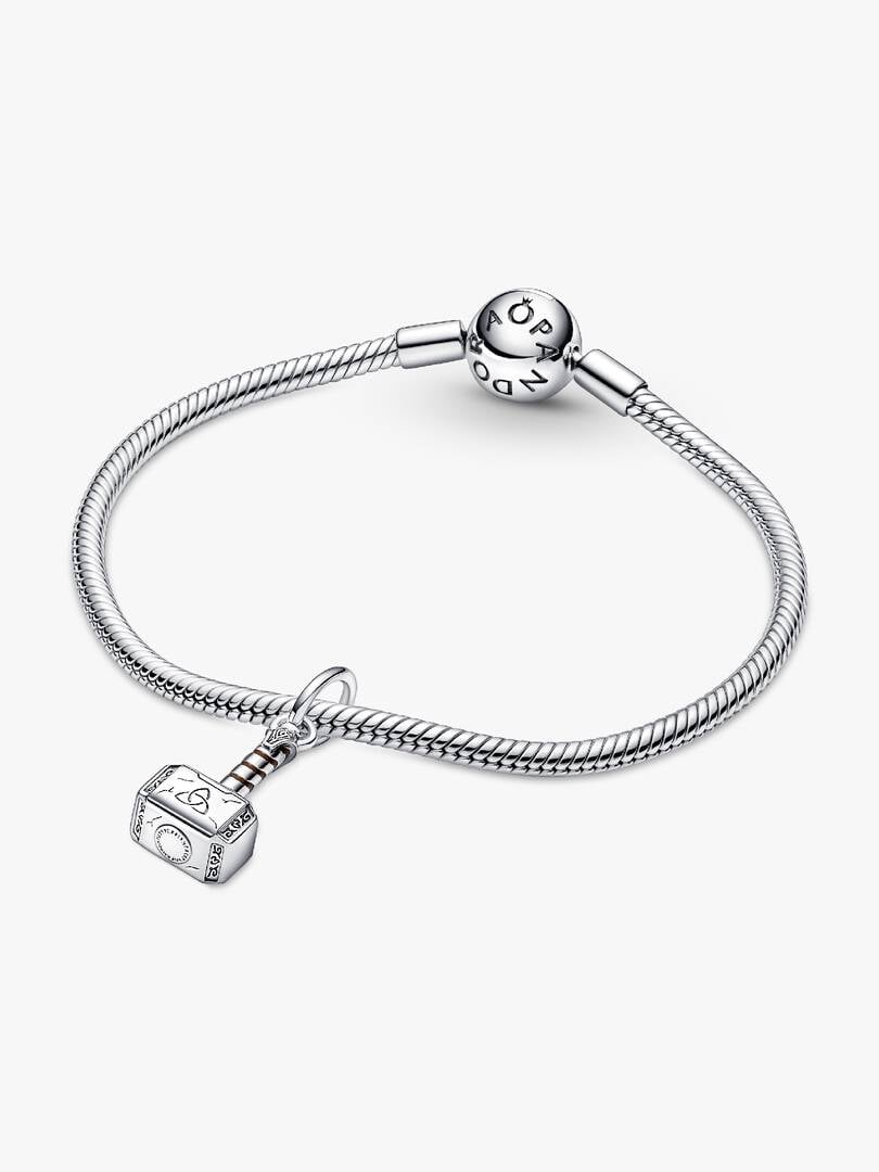 ling brown enamel, engraved scratch marks and Asgardian-style rune symbols. The side of the hammer is engraved with “Worthy” as a reminder of the source of Thor’s power. Add this charm and more of your favorite heroes to our brand Moments Marvel The Avengers Logo Clasp Snake Chain Bracelet.