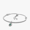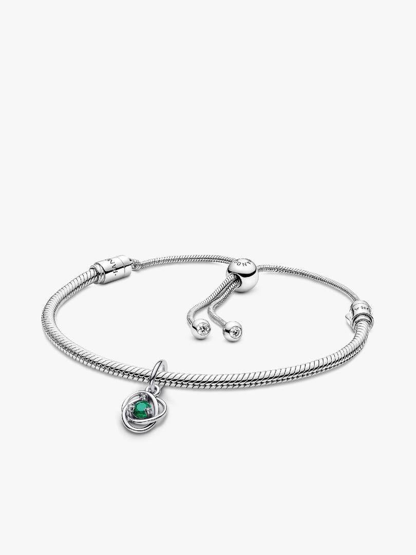 eep green man-made crystal at the center. Surrounded by three small cubic zirconia stones on the front and a cut-out heart shape on the back for maximum sparkle. This dazzling dangle charm comes on a matching sterling silver brand Moments Snake Chain Slider Bracelet. Capture the symbolism of a May birthday, milestone or anniversary with this vibrant set. Unconditionally. Infinitely. Be love.