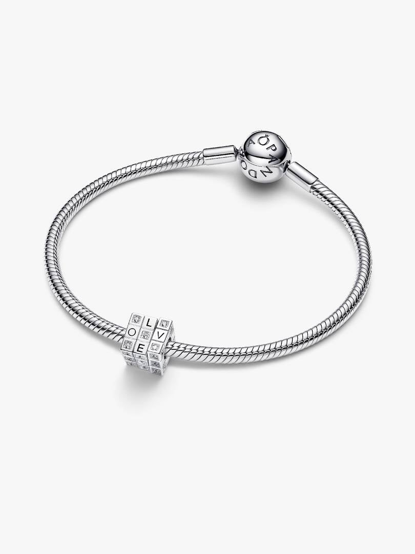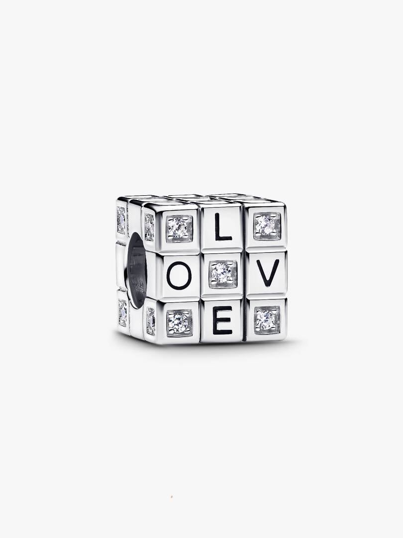 Play the game of love with our Moveable Toy Cube Charm. Crafted in sterling silver with red enamel hearts, sparkling stones and engraved letters on rotating cubes, you can create different combinations and patterns as yo