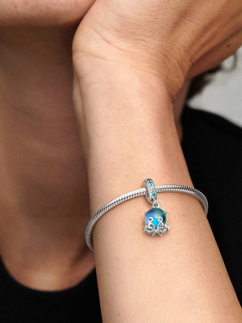Explore the wonderful world of the deep blue sea and add this cute octopus charm to your brand Moments jewelry. This dangle charm features beautiful two-toned green and blue Murano glass with a wavy openwork pattern on