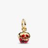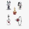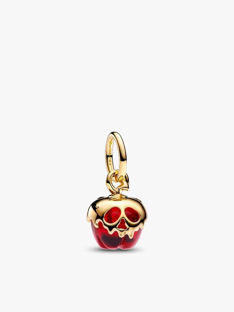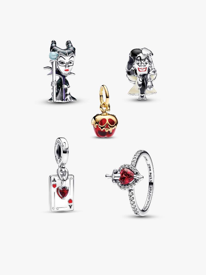 world of magic and mayhem with dark purple velvet and shadow-like icons. Cruella De Vil is shown in sterling silver with her signature black-and-white hair, mink coat and diabolical expression, crafted with hand-applied enamel. The Evil Queen’s emblems take the shape of a shiny red Murano glass apple dripping with 14k gold-plated ‘poison’ and a classic heart-shaped ring, pierced with a dagger. The Queen of Hearts is portrayed on an Ace of Hearts charm, featuring a red man-made crystal heart dangle, and her catchphrase engraved on the back: “Off with their heads!”