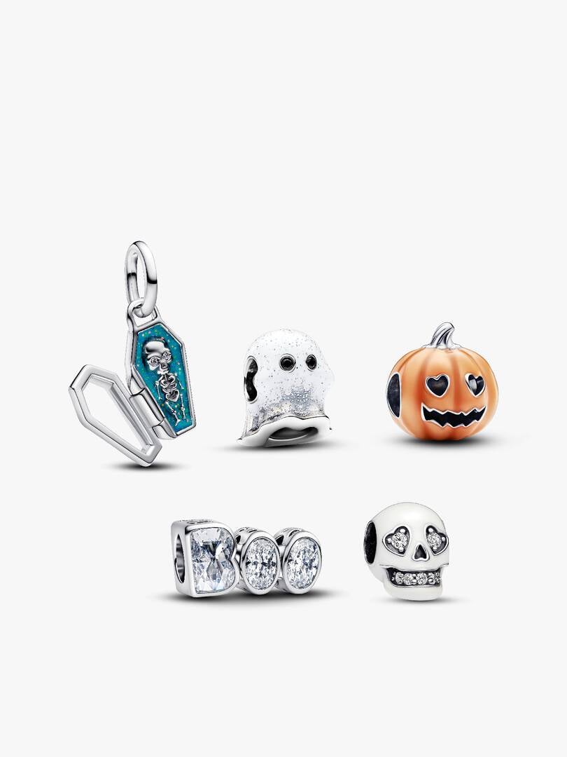 Scare up some sparkle. This glow-in-the-dark charm set includes five frightfully fun styles — from ghosts and pumpkins to coffins and skulls. Made to haunt (and light up) your Halloween look.