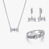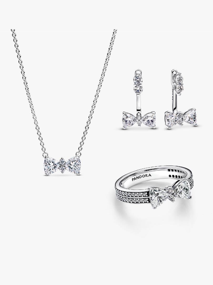 ow motif. The Sparkling Bow Double-Row Ring showcases a contemporary bow design surrounded by clear cubic zirconia. The necklace includes a sparkling bow-shaped centerpiece on an adjustable chain, while the earrings feature faceted stones forming a bow from a sparkling stud, with detachable jackets for versatile styling. Perfect for any occasion, this enchanting set is a wonderful gift for yourself or someone special!
