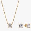 es, creating a modern aesthetic and opening the stone to the light for amplified sparkle. The 14k gold pendant is fixed to a matching diamond-cut cable chain, adjustable to two lengths. The matching earrings feature a 0.50 carat round brilliant excellent cut lab-grown diamond in each earring, with a total carat weight of 1.00.This lab-grown diamond gift set is a universally wearable set that will elevate your looks day and night for years to come.