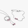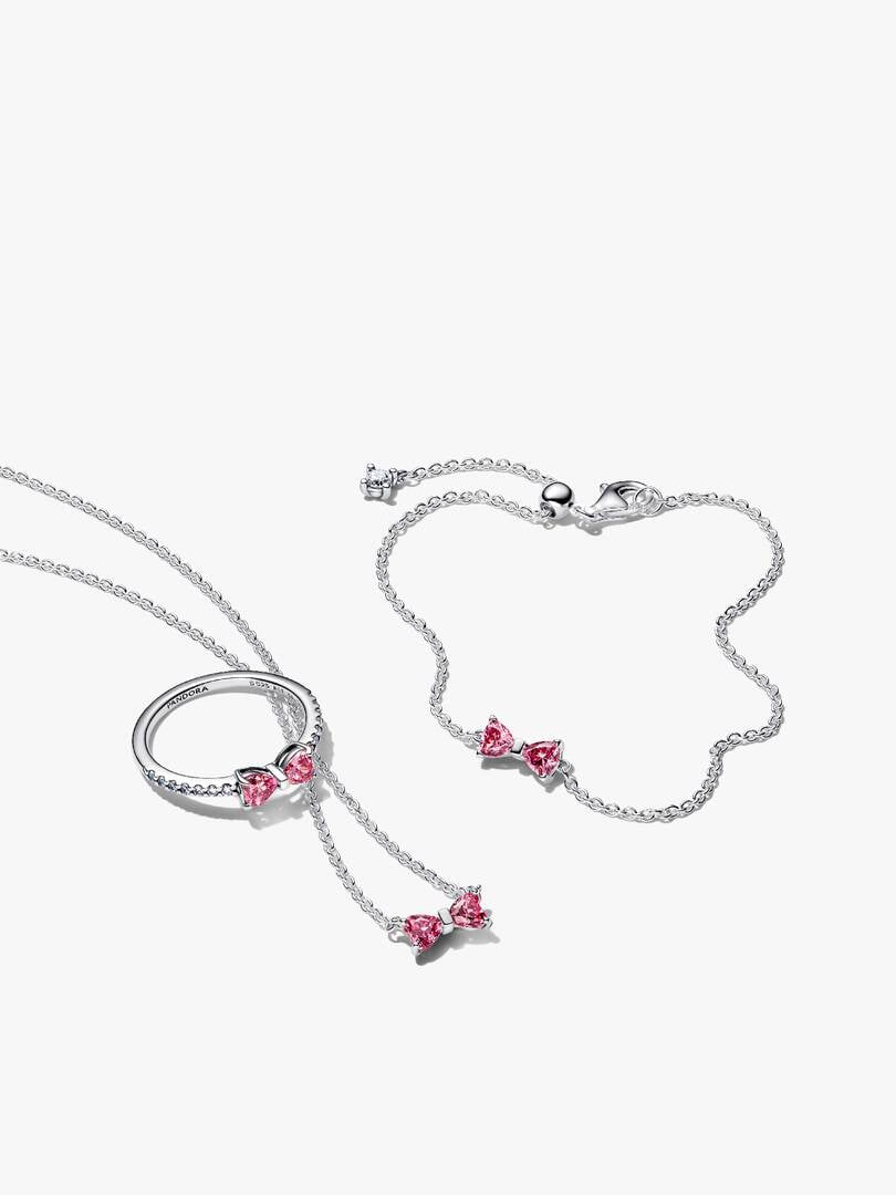 Tie your look together with a bow. Or several. This set includes a matching bracelet, ring, and necklace – each crafted from sterling silver and detailed with a sparkling pink bow.