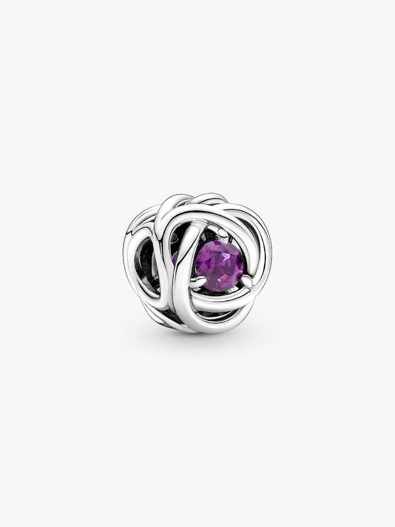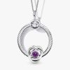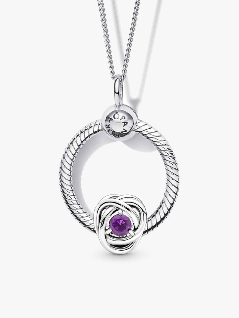 Mark a special February birthday with a Classic Cable Chain Necklace in sterling silver, a snake-chain patterned brand Moments Small O Pendant, and a Purple Eternity Circle Charm with openwork infinity braiding design