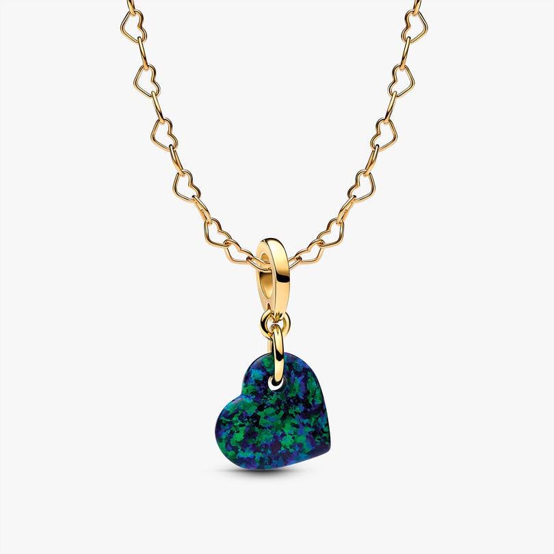 to yourself while opening your heart to others. Intended to empower, inspire and uplift, our lab-created opal heart in amazing green-blue tones is reminiscent of the vibrant hues of the jungle, embodying a wild and adventurous spirit free of constraints. The set includes the 14k gold plated dangle charm and heart link necklace. Radiate it. Be love.