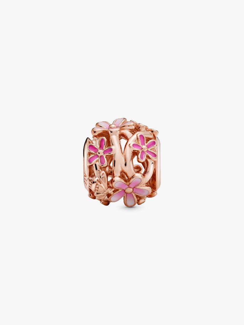 Bring the joy of springtime to your look with this Openwork Pink Daisy Flower Charm. Hand-finished in 14k rose gold plating, this detailed charm features the best of the season including pink daisy flowers, a ladybird an