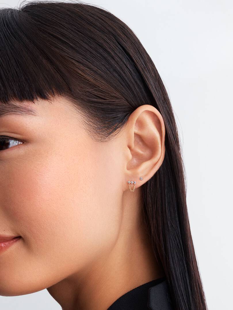 Embrace elegance with our brand Era Lab-Grown Diamond Trio Chain Stud Earrings. Each featuring three lab-grown diamonds with 0.13ct TW, these earrings are prong-set in 14k gold. With a hanging cable chain element, they