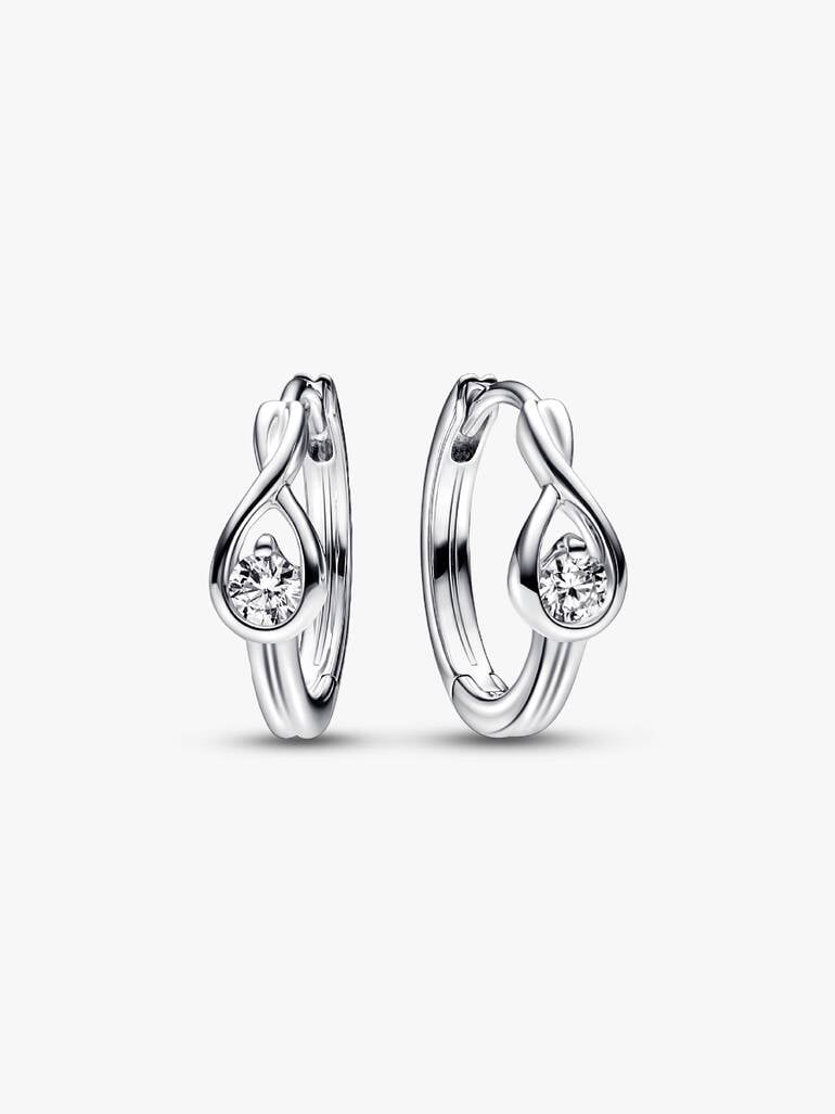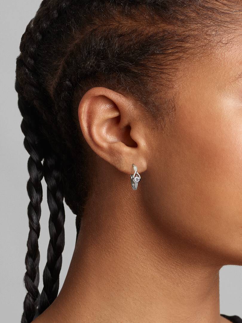 iery round brilliant excellent cut lab-grown diamond in a modern infinity setting that flows seamlessly around the stone and continues into an elegant hoop. For paired earrings, an accompanying certificate warrants the size and quality of each individual stone. Each brand Lab-grown diamond is treated with a post-growth color enhancement called annealing.