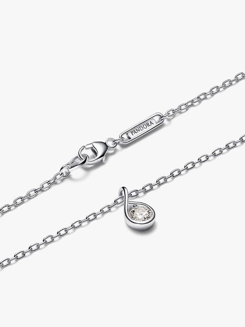 endant features a fiery round brilliant excellent cut lab-grown diamond in a modern infinity setting that flows around the stone and suspends it in mid-air. The chain is easily adjustable to two lengths. Each brand Lab-grown diamond is treated with a post-growth color enhancement called annealing.