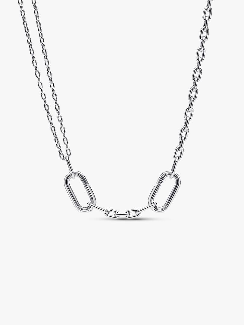 Our sterling silver brand ME Double Link Chain Necklace has endless styling possibilities, featuring two openable links – designed with grooved lines to set them apart – five links between each openable link and a smal