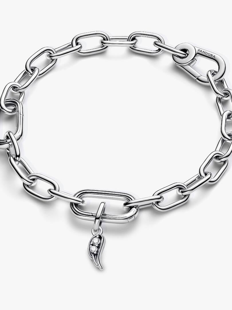 Let your spirits soar when you wear the brand ME Sparkling Angel Wing Mini Dangle Charm. One side of this sterling silver mini dangle charm boasts sparkling stones and raised line detailing, while the reverse features