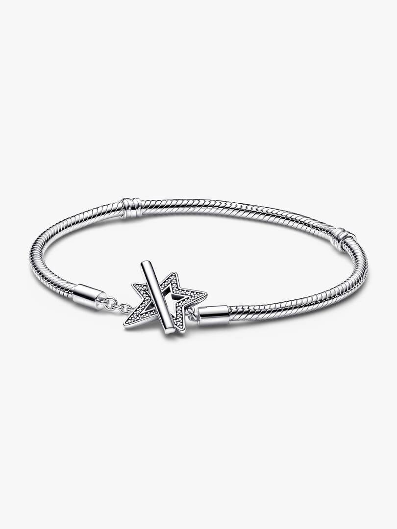 Our brand Moments Asymmetric Star T-bar Snake Chain Bracelet puts starry magic at the center of your styling. This celestial-inspired design features an asymmetric star T-bar clasp in polished sterling silver, carefull