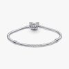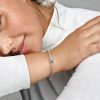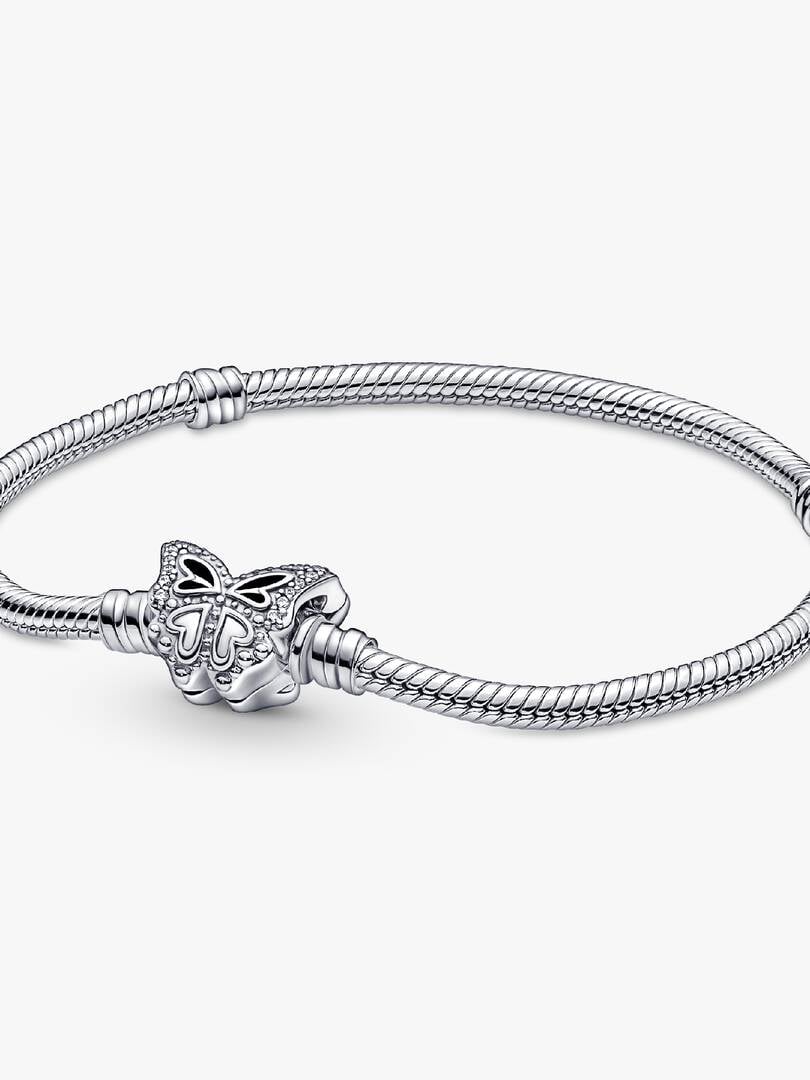 Tell your spring story and be inspired by the season of transformation with our sterling silver brand Moments Butterfly Clasp Snake Chain Bracelet. Cut-out and raised heart details and sparkling bead-set round brillian