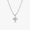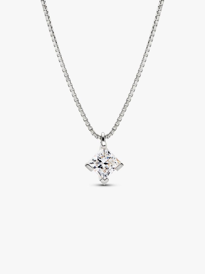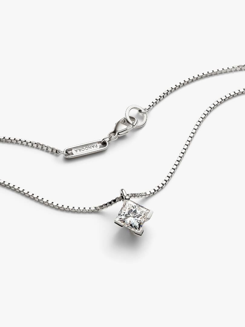 square princess excellent cut lab-grown diamond set in 14k white gold. An asymmetrical prong setting frames the stone and is attached to the chain with a hidden jump ring, making the pendant appear to float on the neckline. The 14k white gold necklace chain is adjustable to two lengths. Wear it as a symbol of the unique light within all of us. Each brand Lab-grown diamond is treated with a post-growth color enhancement called annealing.