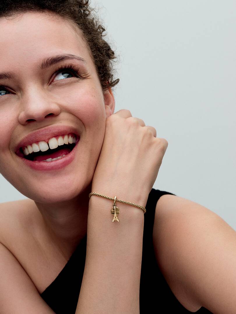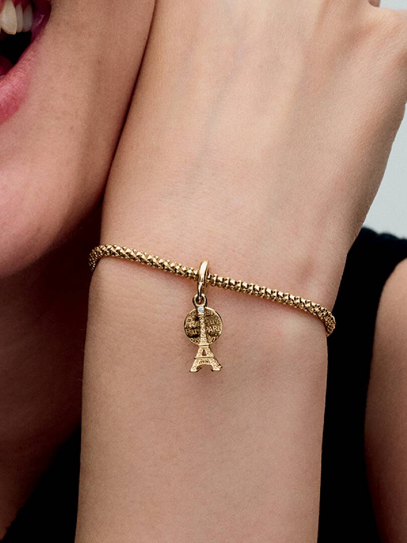 el Tower. A second dangle features a disc engraved with “Paris,” with a polished reverse side ready for your personalized engraving. This Eiffel Tower charm will bring French flair to your look.