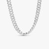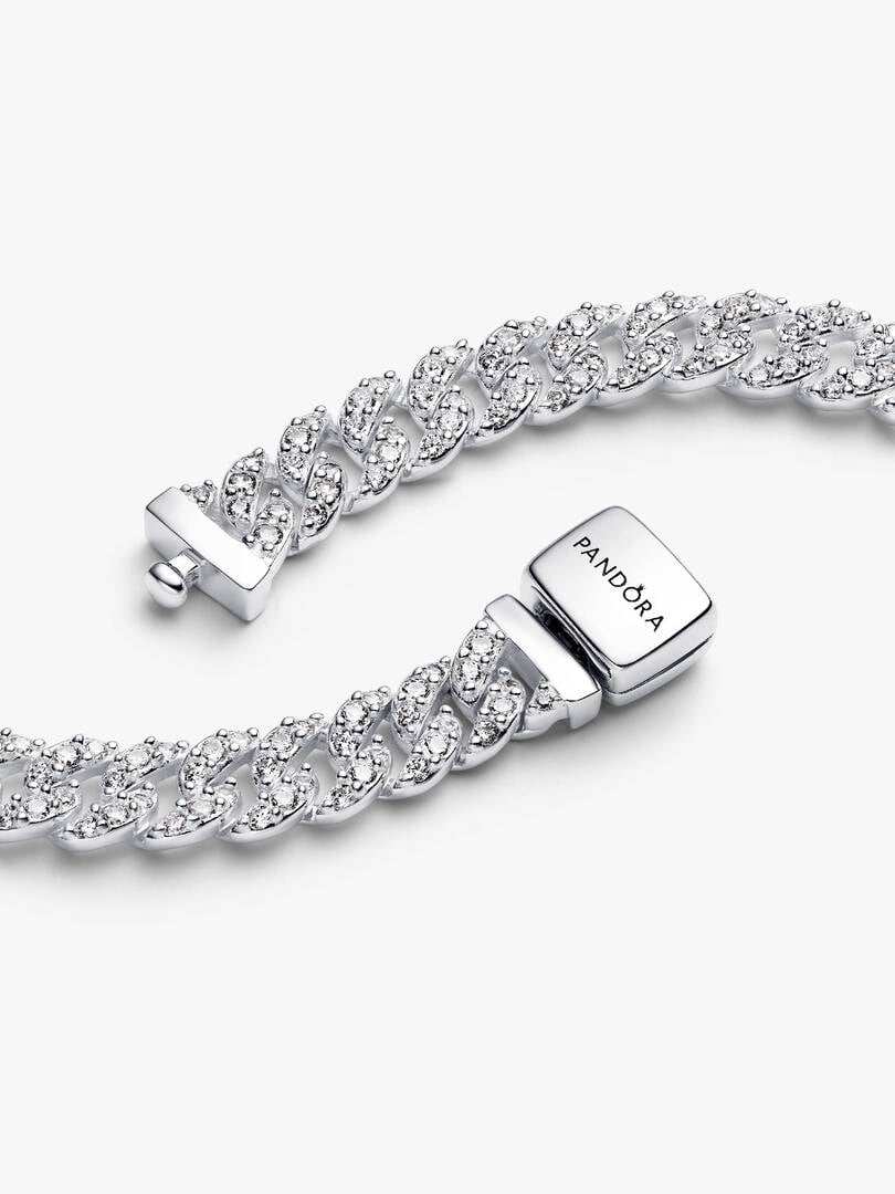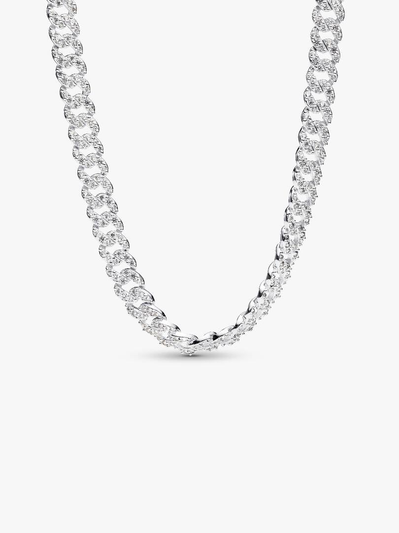 The Pavé Cuban Chain Necklace is a true showstopper. Made from sterling silver, it features a 45 cm Cuban chain adorned with 690 bead-set round brilliant-cut clear cubic zirconia for ultimate sparkle from every angle. Pe