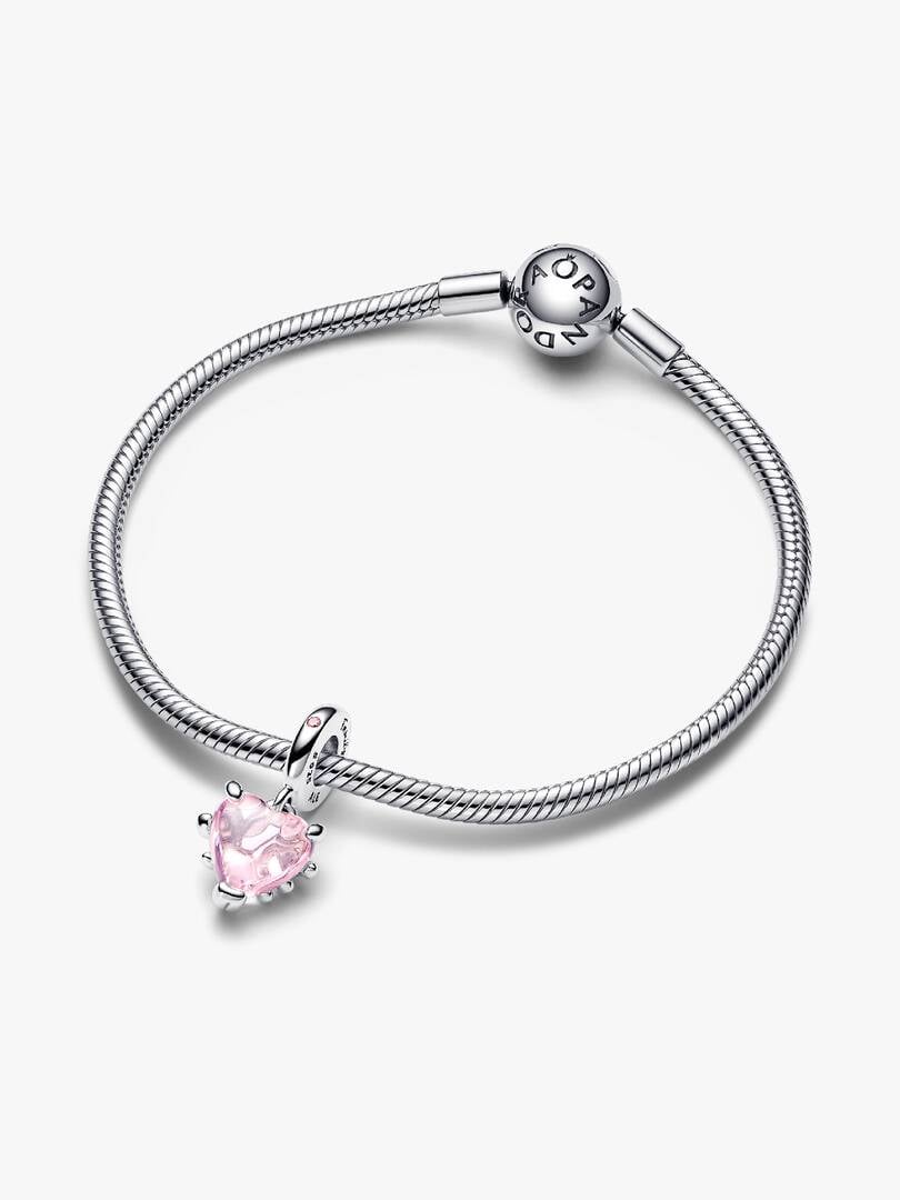 Celebrate the heart of your family with the Pink Family Tree & Heart Dangle Charm. This hand-finished dangle charm is crafted from sterling silver with a transparent pink cabochon man-made crystal shaped like a heart. On