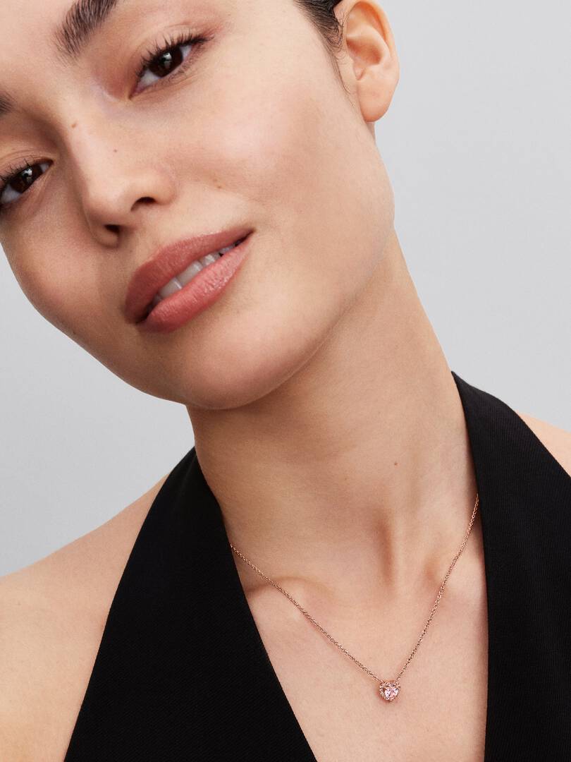A shimmering pink heart stone, framed by sparkling pavé, sits at the center of this elegant necklace – perfect for adding a romantic and vibrant touch to any look.