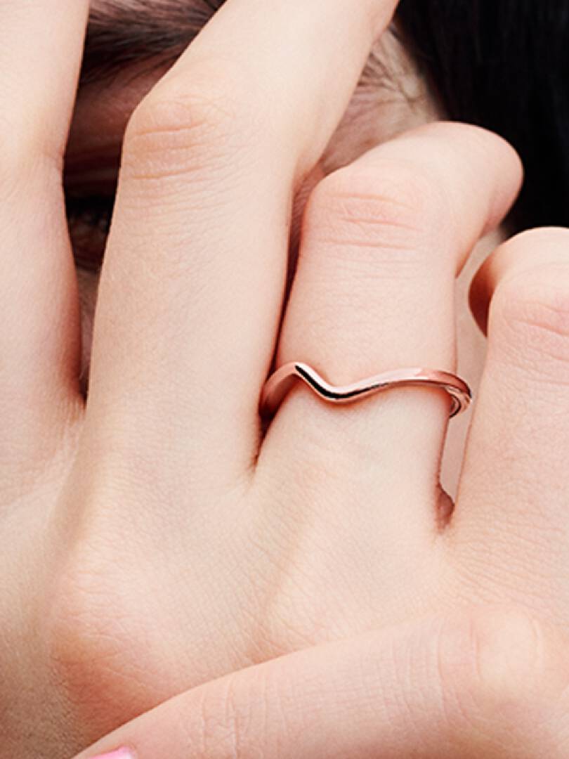 A new wave of stacking. Finished in 14k rose gold plating, our Polished Wave Ring curves to resemble the movement of a wave, with a smooth polished surface. Stack several 14k rose gold-plated rings together or combine wi