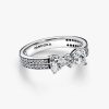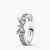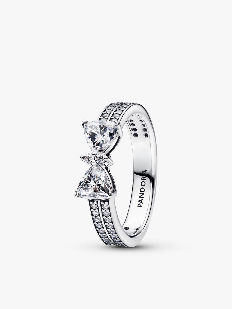 The Sparkling Bow Double-row Ring, crafted from sterling silver, adds a festive touch to any outfit. This ring features a contemporary bow motif surrounded by clear cubic zirconia, as well as a double row of pavé stones
