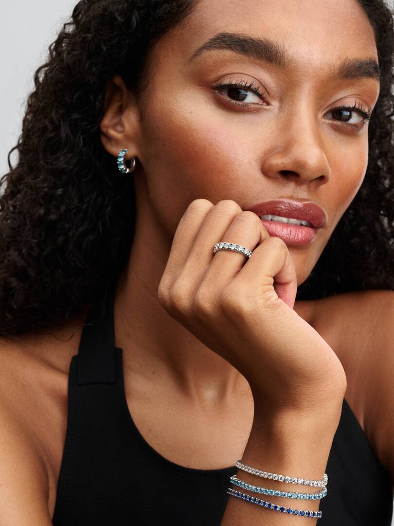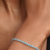 Make a bold statement with this stunning tennis bracelet, showcasing a row of round stones and a smaller stone dangling by the clasp, capturing the essence of modern style.