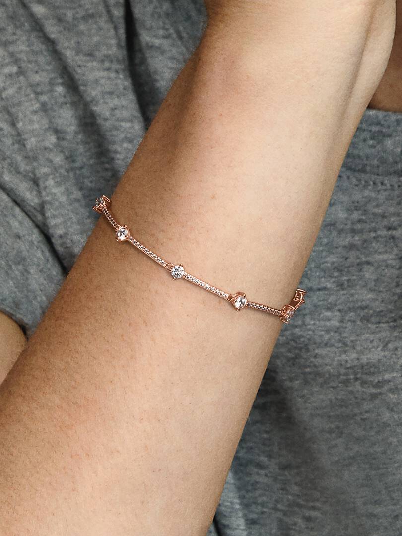 Level up your look with the Sparkling Pavé Bars Bracelet. Hand-finished in brand Rose™ (14k rose gold-plated unique metal blend), this design is inspired by a piece from brand ’s archive. Featuring rigid bars decorate