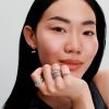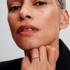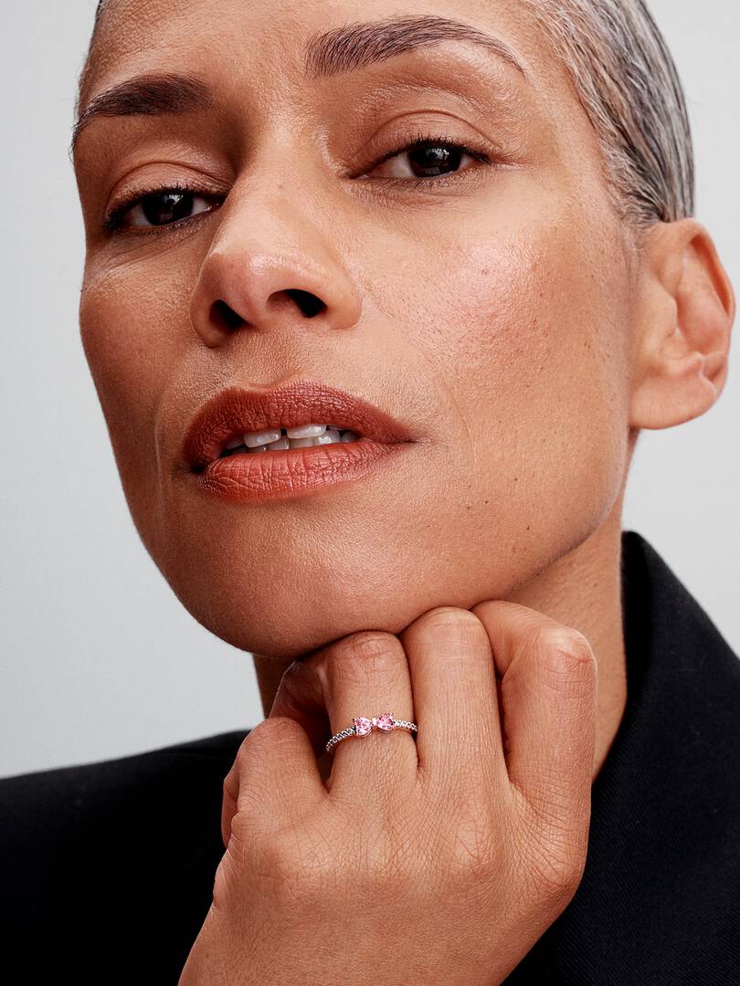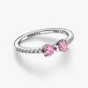 The Sparkling Pink Bow Ring in sterling silver features two heart-cut fancy pink cubic zirconia clear cubic zirconia and a pavé-adorned band. This unique bow motif ring embodies festive light and charm, perfect for any o